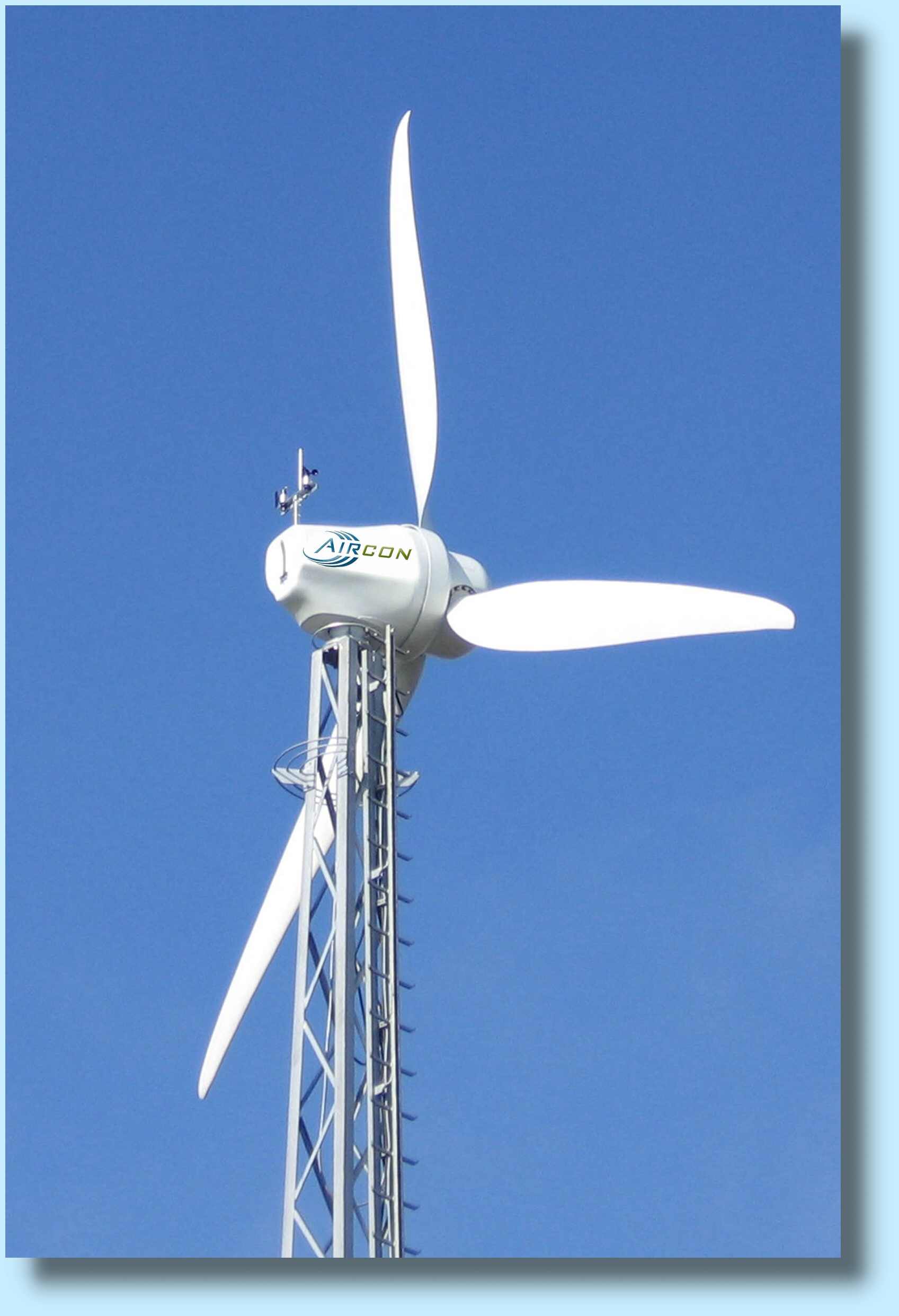AIRCON 10 S - Windkraftanlagen sind speziell zur Netzeinspeisung vorgesehen. Als Besonderheit ist die Windnachführung mittels Getriebe- (Gier-) Motor, der gegen eine Feststellbremse fährt. Das übliche Pendeln" wie bei Windfahnenanlagen entfällt. Die Rotorblätter sind fest an der Nabe befestigt, die Leistung wird mit elektronisch geregelten Stall begrenzt. Ein neu entwickelter, getriebeloser, permanenterregter Scheibengenerator gewährleistet eine hohe Leistung und einen leichten Anlauf . Sicherheit: Zwei voneinander unabhängig wirkende Bremssysteme ( hydraulisch u. elektrisch ) sowie in der Gondel installierte Sensoren für Übertemperatur, Schwingungen, Überdrehzahl und ein Netzüberwachungsrelais gewährleisten einen sicheren Betrieb der Anlage. | |